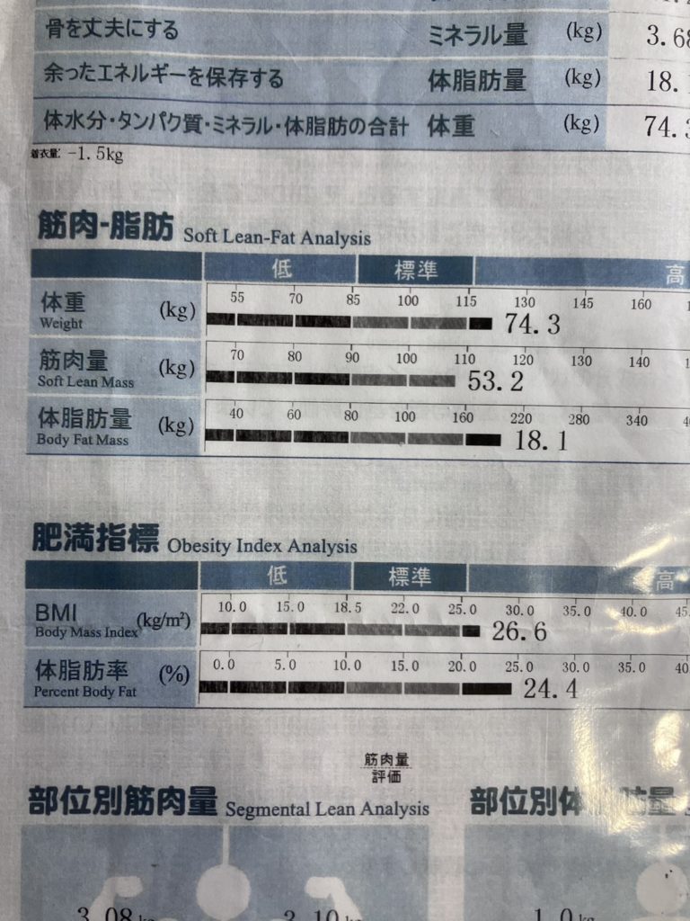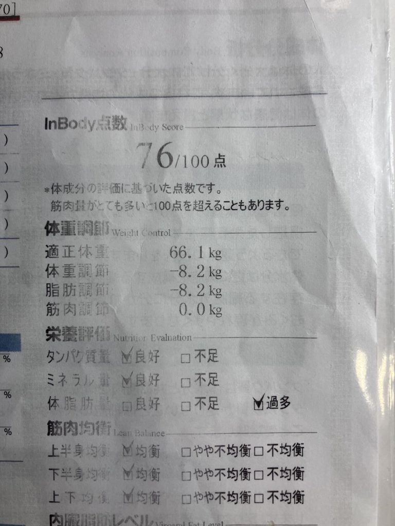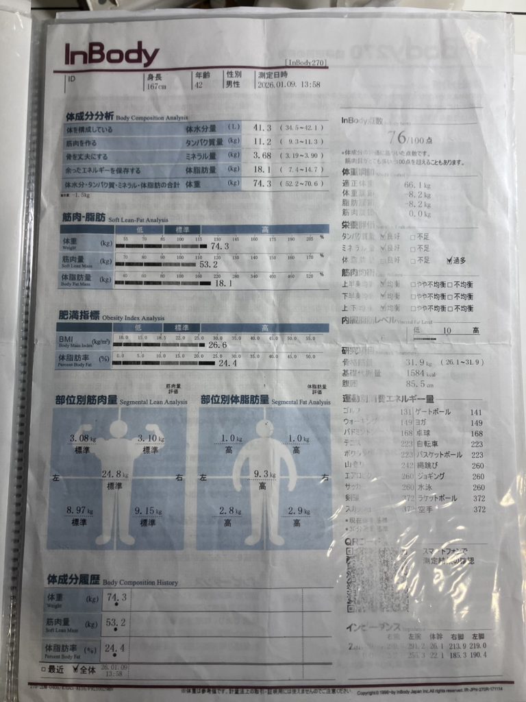 ibodyという体脂肪や筋肉量を調べられる体重計で測ったところ、100点中76点で、肥満状態からの1月でそこそこまで持っていったというのは継続の力だろう。体重、筋肉量などの目安もわかり、次のトレーニングにつながる。体脂肪率が平均より高いのでここを抑えつつ、筋肉量を増やせばもっと点数も伸びるだろう。