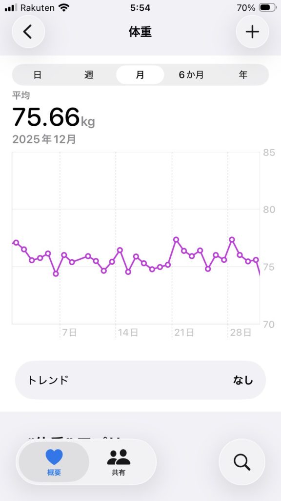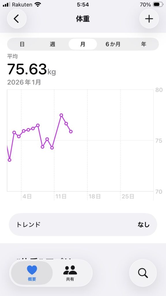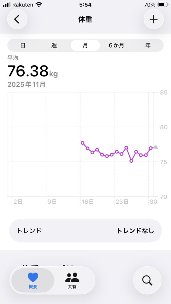 体重の変化はほとんどなく、月単位でみても、増減ない感じ。ダイエット目的だとここは残念だが、有酸素運動や脂肪を減らす食事を取り入れることでこれから数値を上げていきたい。
